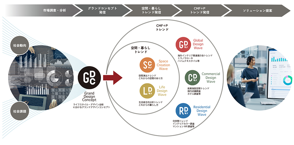 「Grand Design Concept(GDC)」とは、生活者や空間に関する現状調査・分析から、独自のネットワークや最先端の情報からライフスタイルやデザイントレンドを捉え、今後のデザインの方向性を示すものです。複雑さを増していく世界情勢のもと、多様な暮らし方や働き方の変容、新しい価値観の登場など集団がそれぞれにより良い未来を目指す時代から、コミュニティ全体が調和しながら相互作用によって共に進化する時代に移り変わろうとしています。