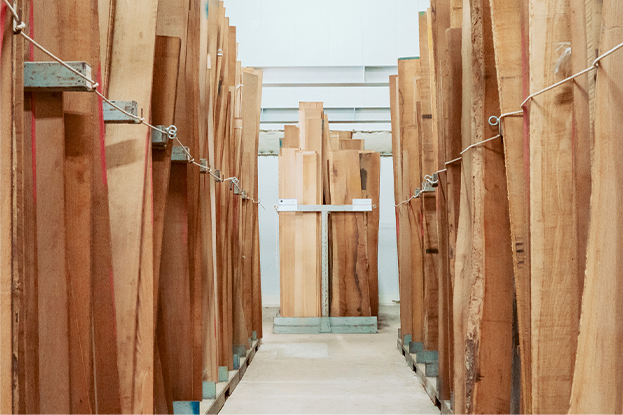 木、石、メタル、コンクリート、モルタル、テキスタイルなど、サーフェースデザインに取り込む素材は、インテリアシーンやトレンドに合わせてデザイナーがセレクトします。例えばオーク材だけでも数千種類の天然素材の中から木目の出方を細部まで徹底チェック。