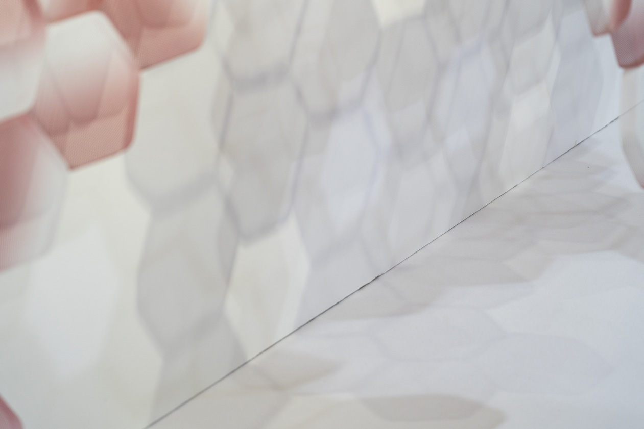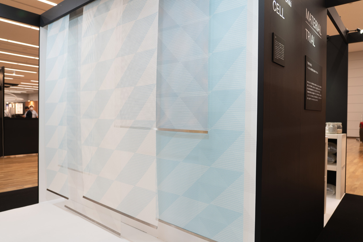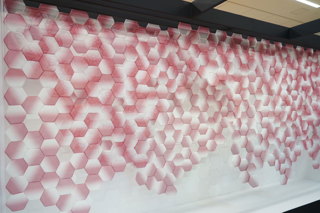 この作品は、ポリエステル繊維製の「三軸織物」を型押し成形して制作したパーツを連結していくことで出来上がるパーティションである。三軸織物のもつ多軸への強さの特徴を最大限に活かすために、パーツの形状には正六角形を採用。成形前にグラデーション状の印刷を施し、ランダムに回転させながら繋ぎ合わせることで全体に色のムラが現れる仕掛けとなっている。小さな部分の集合により様々な形状や表情を生み出すことを目指したことから、自然界を構成する基本単位である細胞を意味する「CELL」と名付けた。