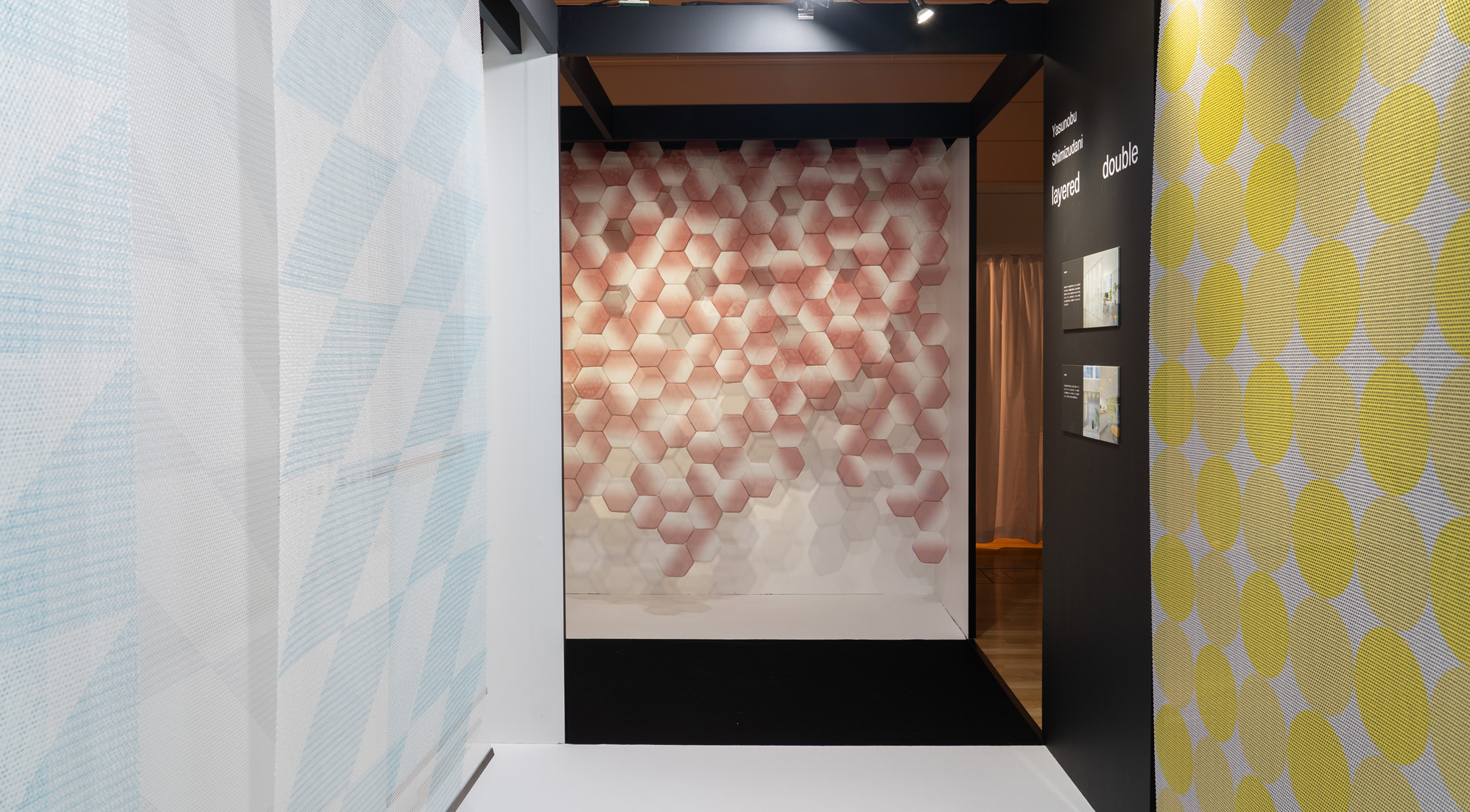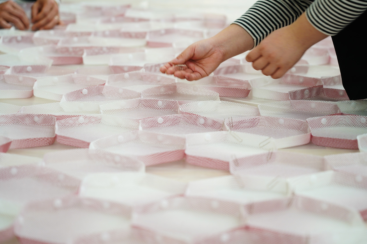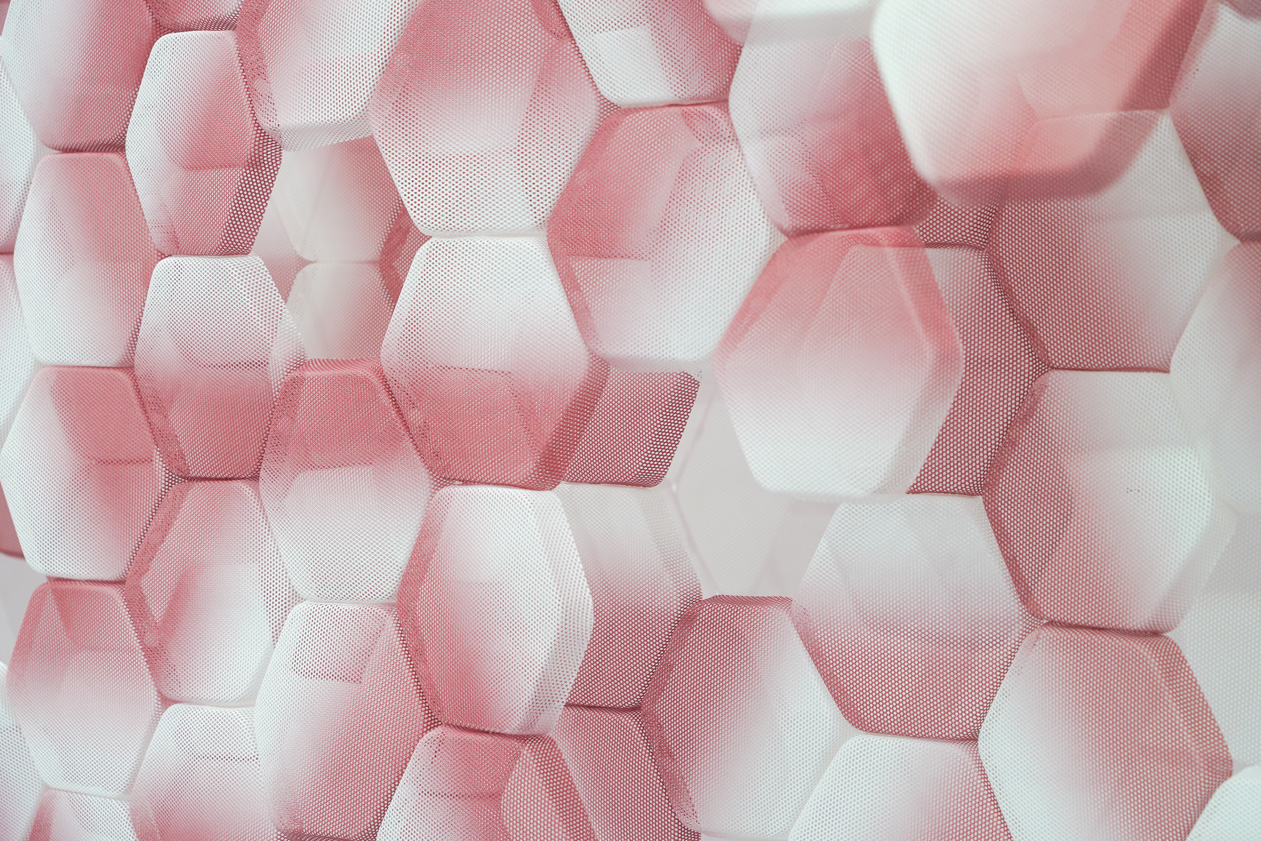 この作品は、ポリエステル繊維製の「三軸織物」を型押し成形して制作したパーツを連結していくことで出来上がるパーティションである。三軸織物のもつ多軸への強さの特徴を最大限に活かすために、パーツの形状には正六角形を採用。成形前にグラデーション状の印刷を施し、ランダムに回転させながら繋ぎ合わせることで全体に色のムラが現れる仕掛けとなっている。小さな部分の集合により様々な形状や表情を生み出すことを目指したことから、自然界を構成する基本単位である細胞を意味する「CELL」と名付けた。
