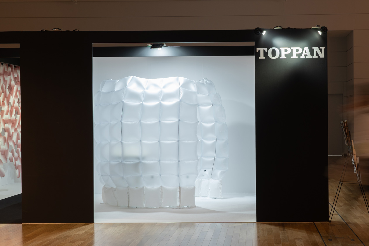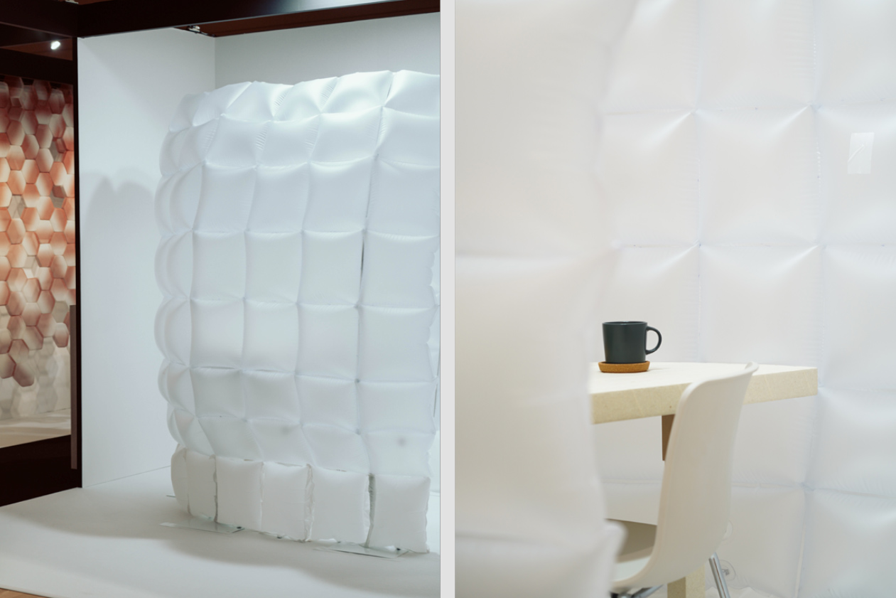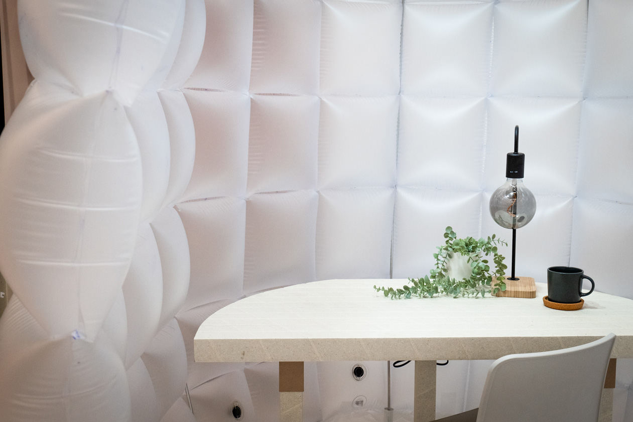 使用済み紙おむつから再生された樹脂シートを活用するためにデザインしました。※ 空気で膨らんだ半透明の二重膜は人と人の間に適度な距離感を作り、設置された空間に優しい印象を与えることでコロナ禍を経た私たちの働き方にふんわりと寄り添います。また、空気を抜いて小さく折り畳たためるので輸送時のコストを低く抑えることが可能です。