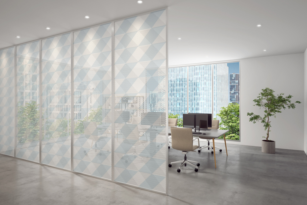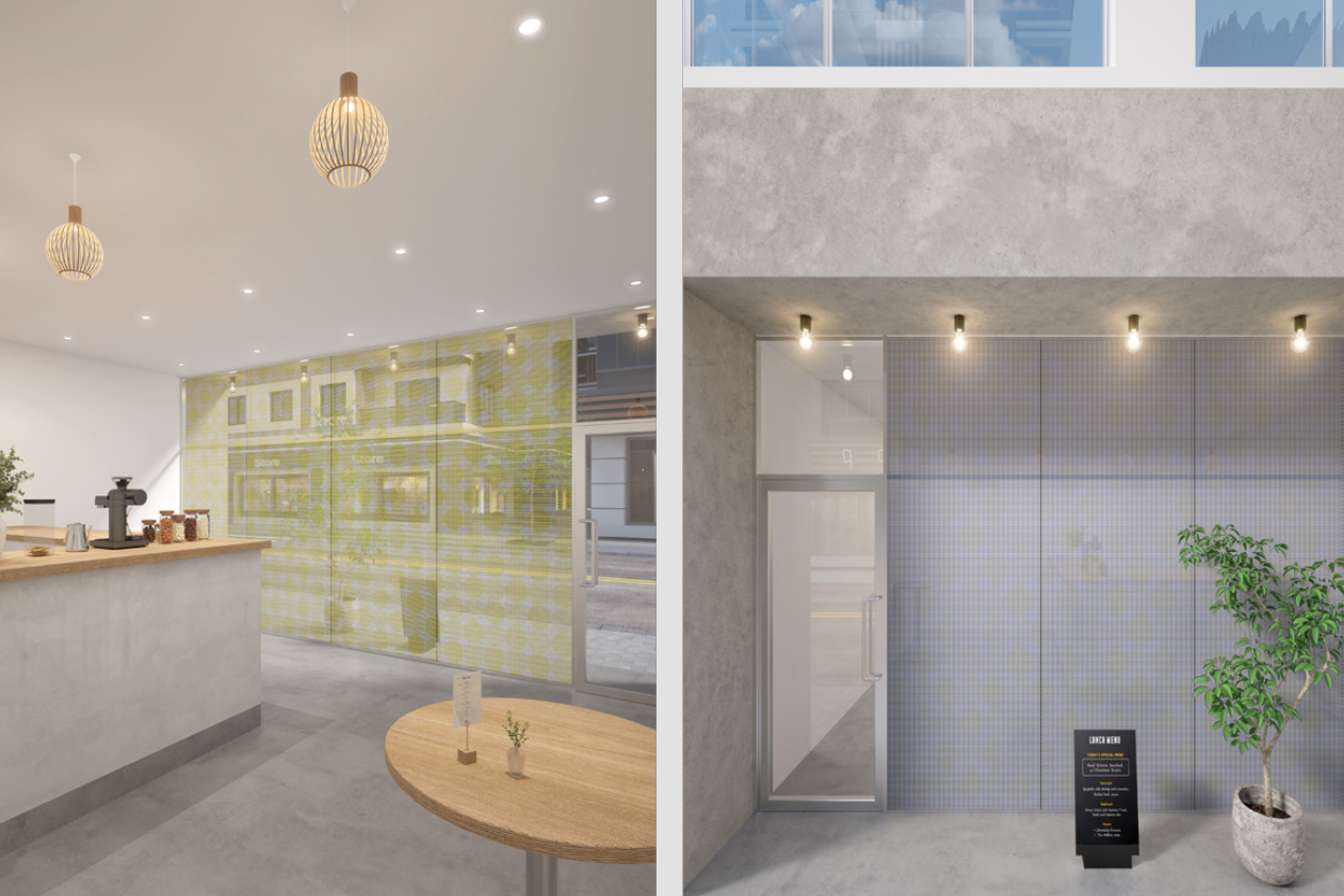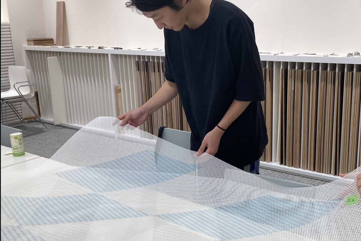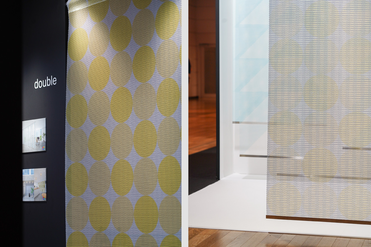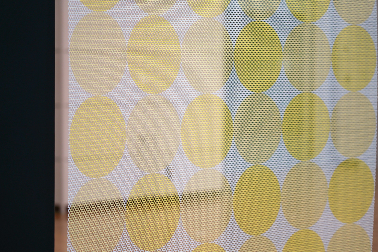 印象の異なる柄や色彩を、表と裏、両面にプリントすることでコラージュを生み出す。メッシュ構造である三軸織物にパターンを施すことで、見る角度や光によって変容しながら新たな模様が現れる。