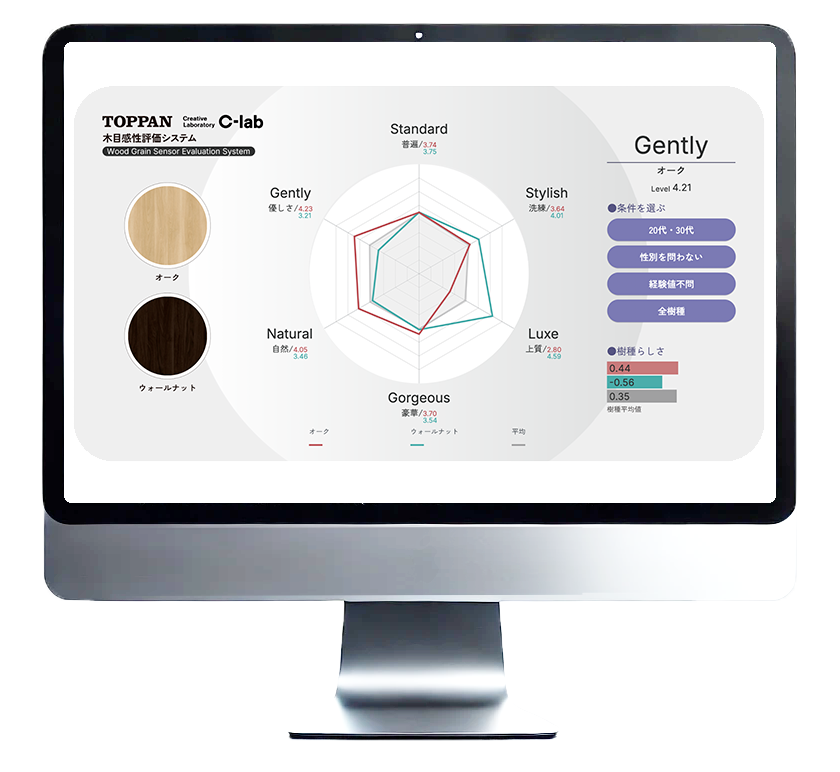 さまざまな属性の被験者の感性評価のデータを収集しシステムを開発。性別や年代層だけでなく「木目柄について評価する経験値が高いプロ」や「経験値の浅い一般人」といった属性毎の感性評価の推定が可能になっています。