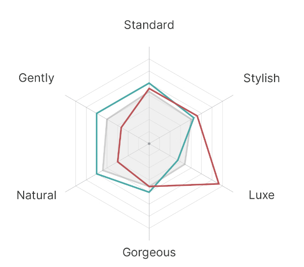 木目柄に対する複雑な感性評価を「Standard=普遍的な」「Stylish=スタイリッシュ」「Luxe=上質」「Gorgeous=高級」「Natural=自然」「Gently=やさしさ」の6つのグループに分類し、定量化。木目柄がどのような感性傾向を持つのか一目で判定できます。