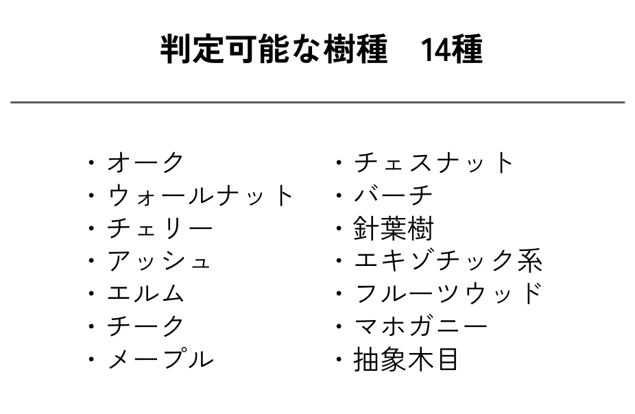 AIを学習させる際に、膨大な数の木目データに樹種の情報もセットにしてインプット。対象データにどのくらいの樹種らしさが表れているのかを判定可能になりました。