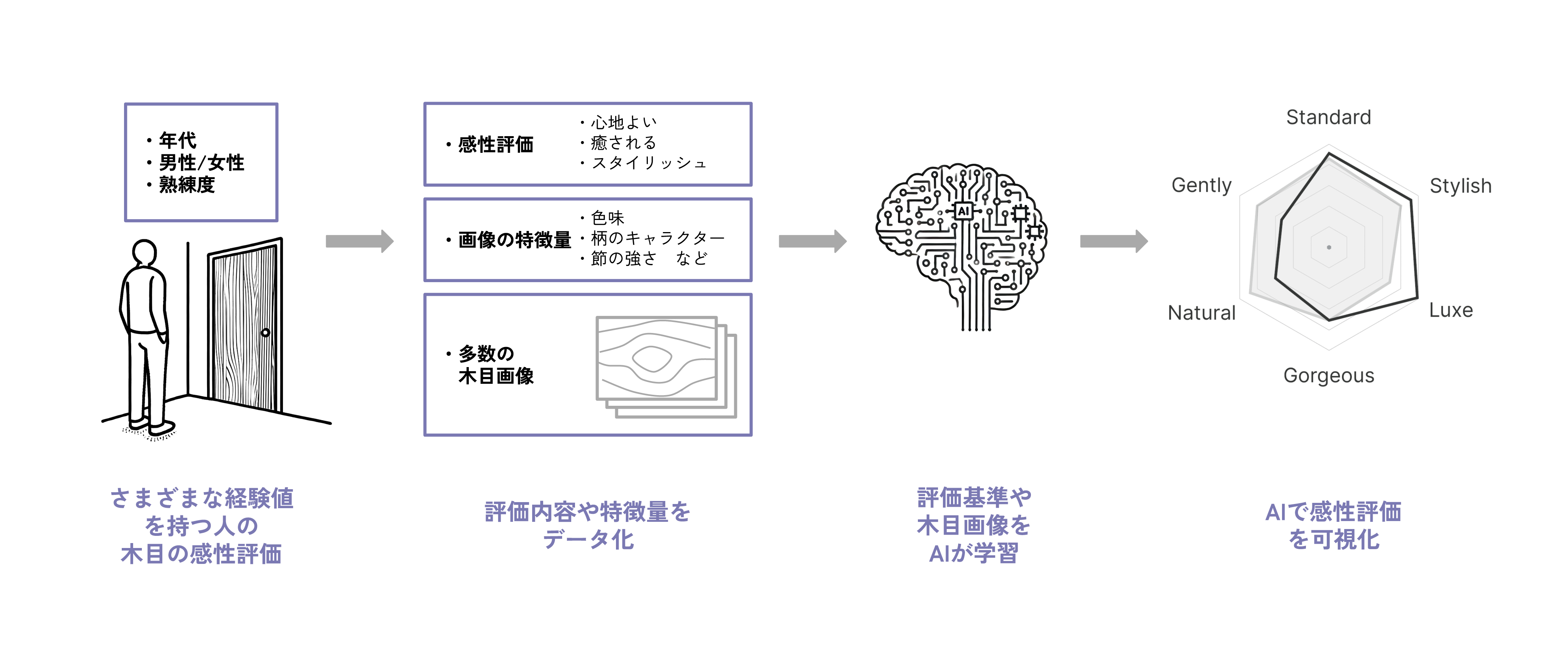 木目柄の画像2000枚以上を集めて、それぞれの感性評価と柄の特徴量を機械学習でAIに学習させることで、感性評価を予測するアルゴリズムを開発。感性評価の学習には、3万件以上の評価データを収集し、高精度の感性予測を可能にしました。
