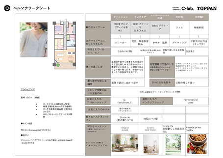 様々な手法で集めた断片的なユーザー像のヒントを、C-lab.独自の蓄積されたノウハウで「ペルソナ」として組み上げ、資料として集約