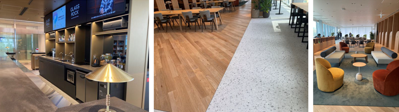 さらに奥に進むと、ソファスペースにはグリーンがかったグレーのカーペット、テーブル席にはナチュラル仕上げのオーク材、窓際のゾーンにはニュートラルカラーのテラゾーが用いられており、床材がシーンごとに巧みに貼り分けられています。