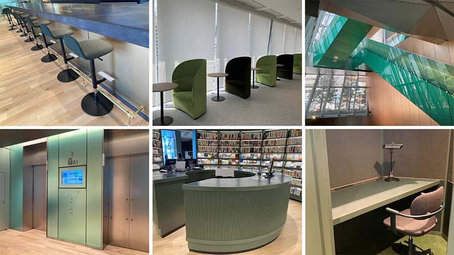3階奥に設けられた有料ラウンジにも、同系色のグリーンが多用されており、視覚的な落ち着きをもたらすことで、訪れる人の集中を促します。