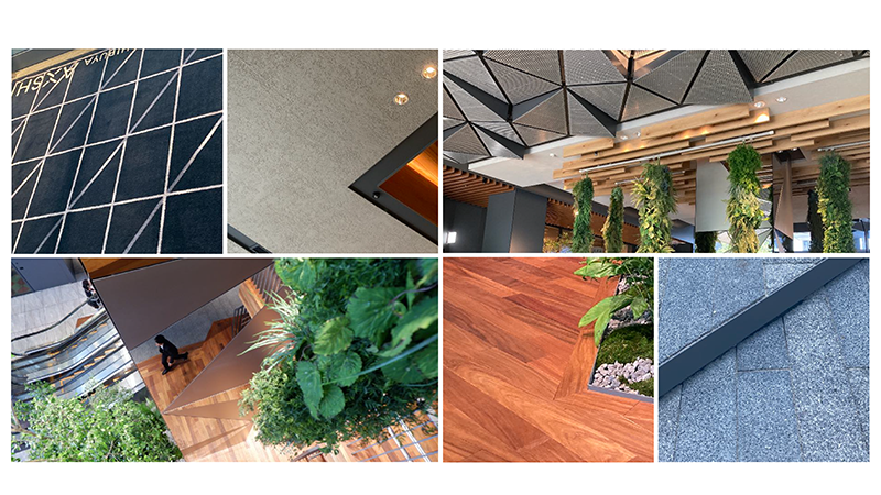 アトリウム同様にマテリアルミックスが多用されており、壁面ではダークグレーの塗装壁、ガラス、亜鉛メッキ鋼板、床材にはブラウンウォールナット材や白を基調としたチェッポストーンを切り替えて配置。天井は前述のミラー素材と明色の左官仕上げが切り替えで組み込まれています。これらの素材が訪問者の目を引き、空間を彩る多くの植栽のグリーンと響き合い、落ち着きの中にも明るさを感じる空間となっています。