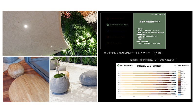 C-lab.では2010年から新しい店舗・施設のデザイン動向をJAFCA日本流行色協会様との協業により、経年的に調査し、トピックスとして分析、その年のCMFPの動向と合わせ、まとめています。ご興味のある方は是非とも【お問合わせ】からご連絡をお待ちしております。