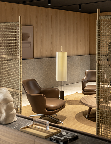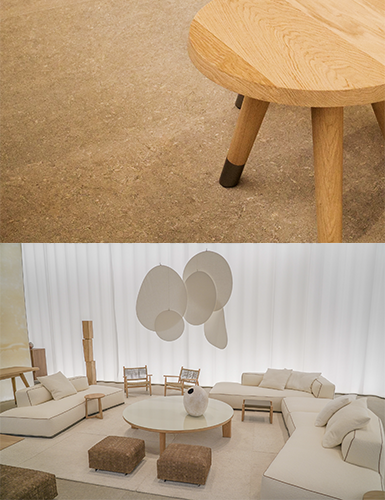 インテリアを引き立てる展示空間の壁面や床に使われていたライムストーンとオークの組み合わせです。