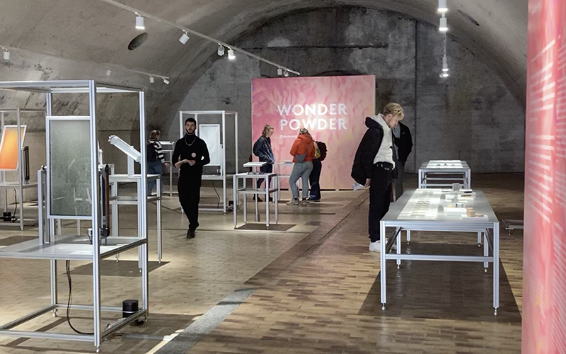 写真のように粉末を水と混ぜることで魅せる「美しさ」を、およそ2年かけて探求した研究成果のインスタレーション作品です。