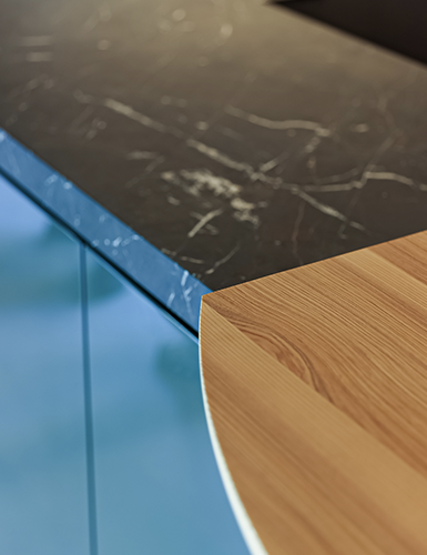 同じくイタリアのボローニャにて昨年度9月に開催されましたセラミックの見本市cersaieにて我々が注目していた素材でもあり、ポスト・モルタルとしても今後人気が出るに違いない石種です。新作家具の魅力を引き出すアクセントとして大きな役目を果たしています。