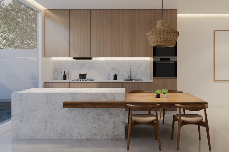 現代的でスタイリッシュなインテリアで、直線的なデザインが印象的です。グレージュトーンとの調和があるスタイルです。