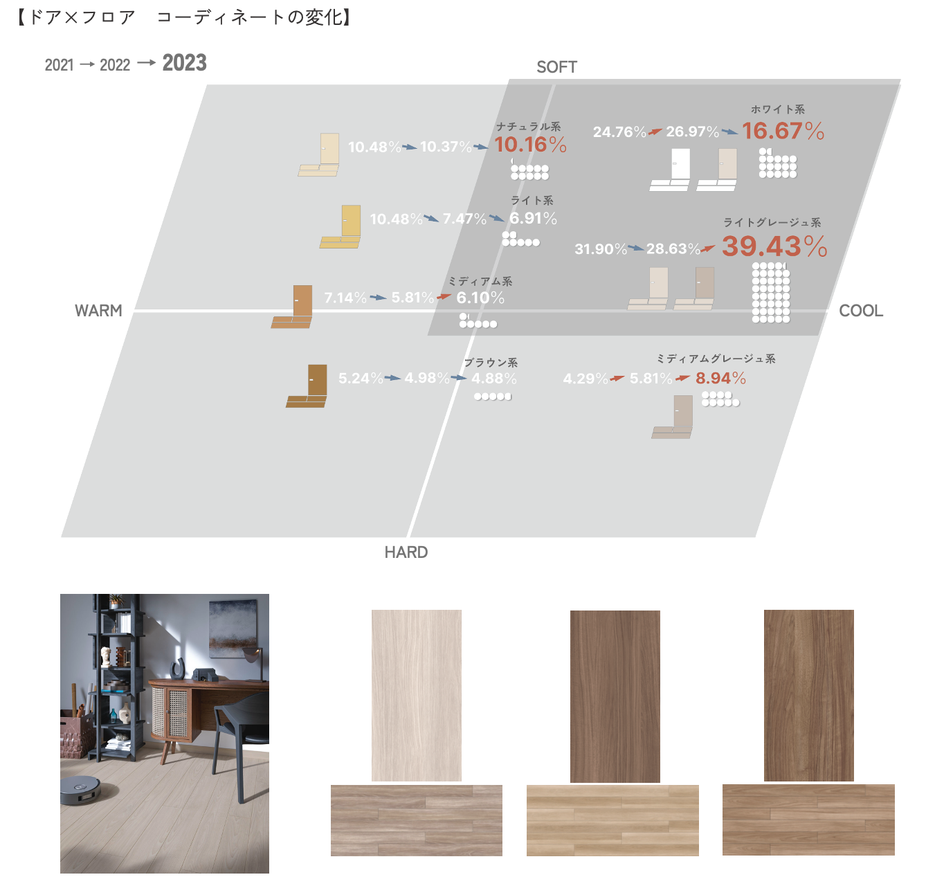 リビングフロアのカラーはホワイト、ナチュラル、ライトグレージュといった色が大きなボリュームで、ドアよりも明るいカラーの比率が高くなっています。色系としては、ドアと同様にグレージュ系色、特にライトグレージュが多くなっており、 ホワイトからライトグレージュへのシフトの兆しも見られます。ホワイトに比べて対応できるスタイルが幅広いなど、より汎用性の高いライトグレージュが求められていると考えられます。