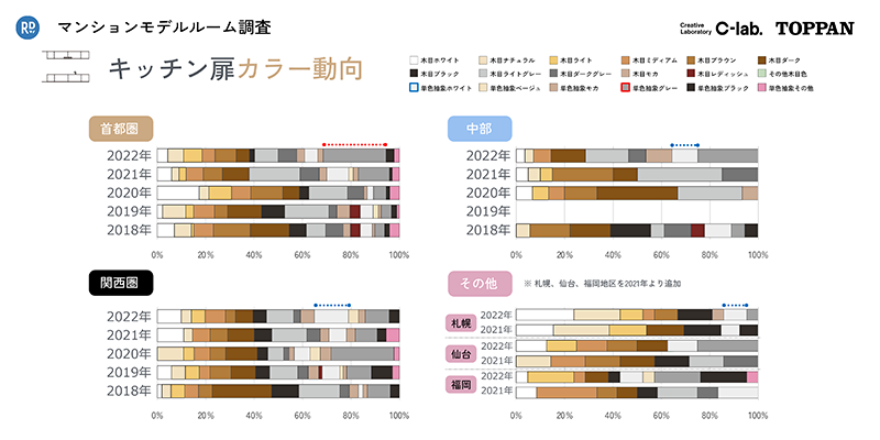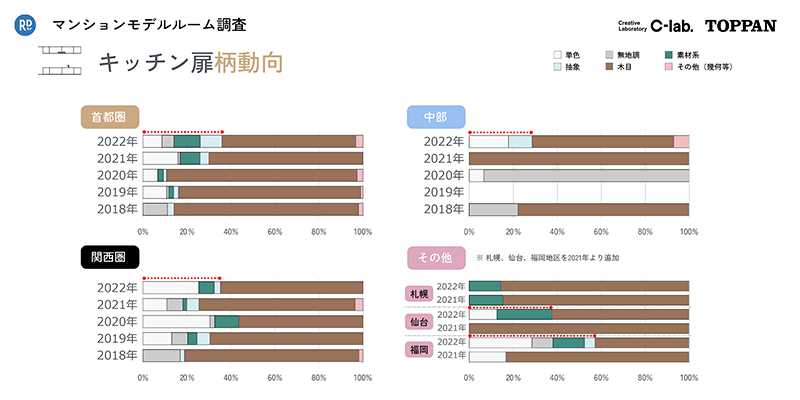 首都圏では、単色抽象グレーのキッチン扉が占める割合が、過去と比較すると大きく増加しています。一方、首都圏以外の地域では、単色抽象ホワイトのキッチン扉の比率が高くなったところが多いことがわかりました。