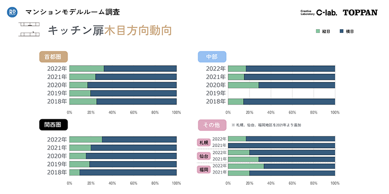 続いて、木目の縦目と横目のどちらが使用されているかを地域・年ごとに調査しました。調査によって、キッチン扉の木目は地域にかかわらず、横目が大半を占めることがわかりました。