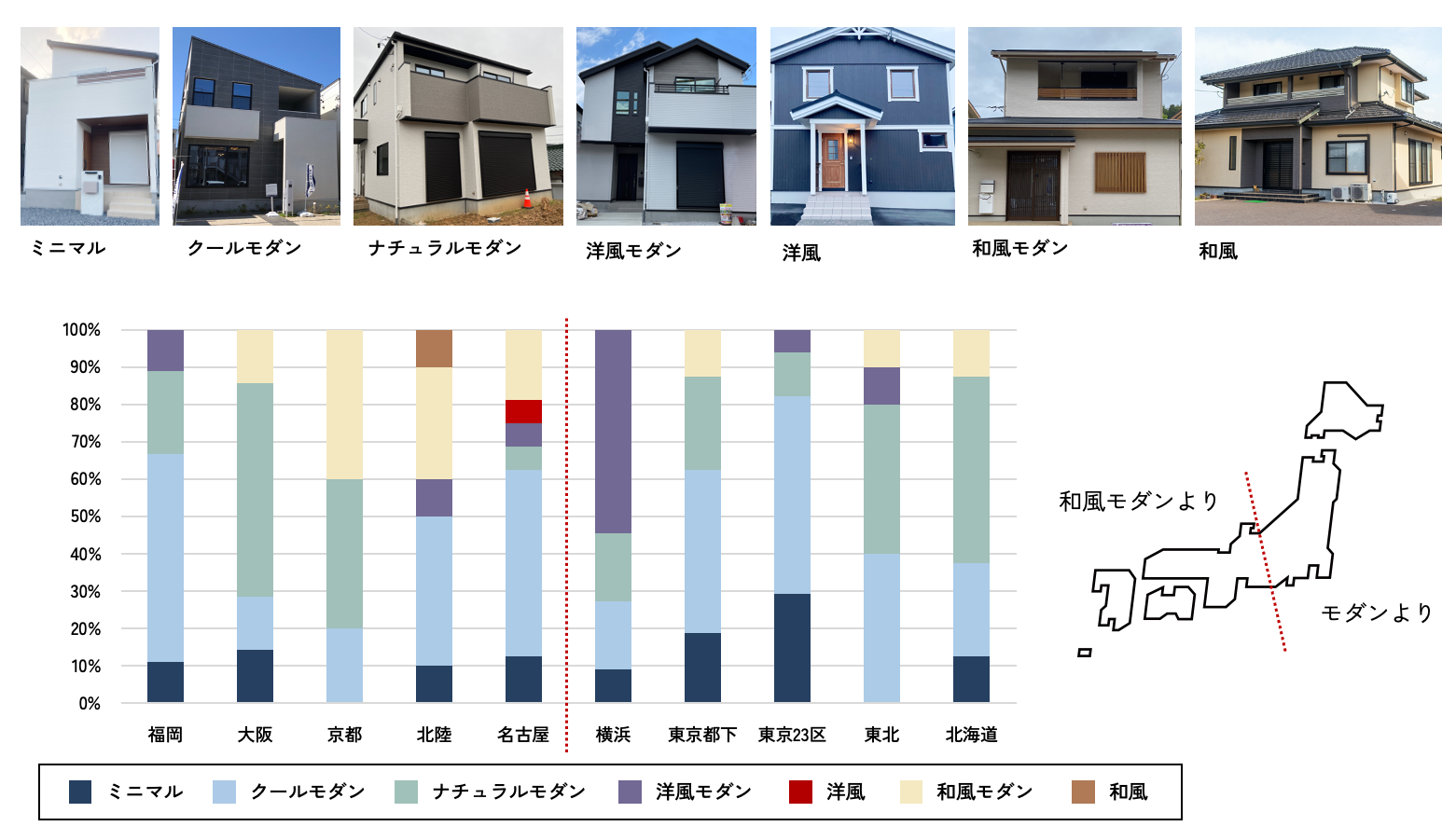 注文住宅について、北海道から福岡まで10の地域で、スタイル比較を実施。住宅外観スタイルはミニマルから和風までの7つに分類。大きな特徴として、中部地方より西は和風モダンや和風が、東はモダンよりなスタイルが多く見られました。横浜に洋風モダンが多いのは今年度の特異値として今後注意深く見ていきます。東京23区は狭小地が多いためか、ミニマルが多い傾向となりました。