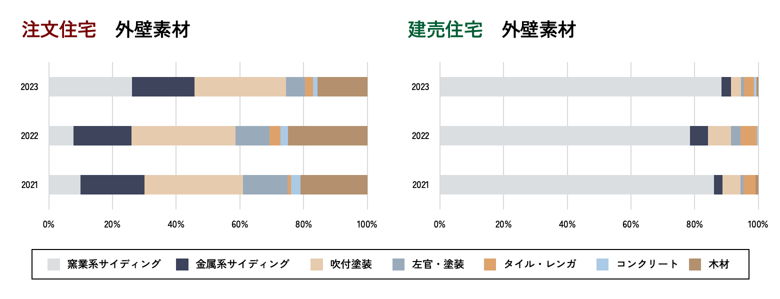 注文住宅と建売住宅の外壁素材を比較。注文住宅は窯業系サイディング、金属系サイディング、吹付塗装など様々な素材が使用されています。建売住宅は窯業系サイディングが8割以上を占める状態が続いています。この理由として、窯業系サイディングがコストパフォーマンスに優れ、色柄が豊富に揃っていることが考えられます。