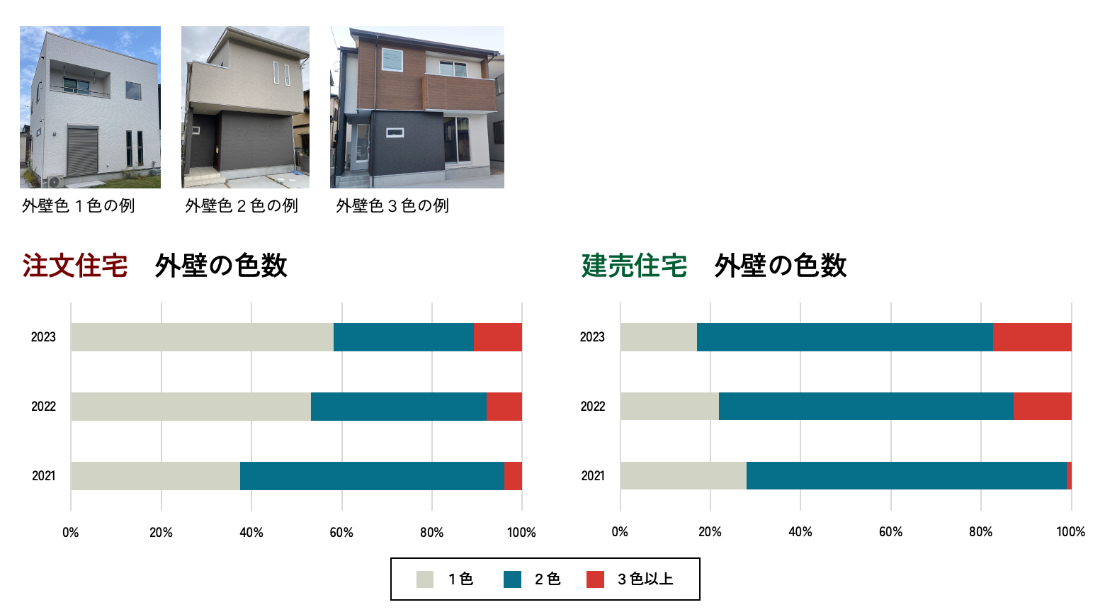 注文住宅と建売住宅の外壁の貼り分けを比較。注文住宅は2色が多かったのですが、1色と3色以上が増加傾向にあります。1色は注文住宅に多いシンプル志向、3色以上の増加は窯業系サイディングの増加が理由と思われます。建売住宅は以前から2色が多く、1色が減少して、3色以上が増加しています。色柄の豊富な窯業系サイディングを自由に組み合わせて外壁をデザインしているものと思われます。注文・建売住宅を問わず2色以上の外壁では、玄関廻りにアクセントカラーを用いる事例が多く見られます。
