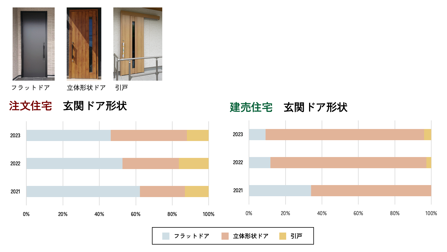 玄関ドア形状を3タイプに分けて比較。注文住宅では、フラットドアが多かったのですが、立体形状が増加しています。また引戸も1割強の割合で見られます。注文住宅の傾向として機能を優先したシンプルなデザインが多いのが特徴です。建売住宅では、立体形状が多くなっており、住宅外観の見せ場として重要なアイテムになっています。引戸は僅かですが狭小住宅で採用されています。