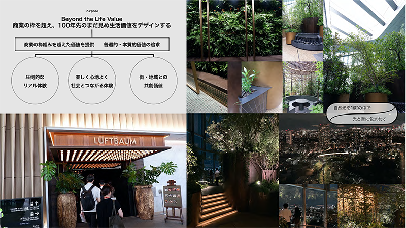 Sさん:体験可能な仕掛けが多数あるのがポイントですが、圧倒的なリアル体験として紹介したいのが「LUFTBAUM(ルフトバウム)」ですよね。28階に出現した「森」にいるような体験。100坪超の屋外ガーデン。富士山も望む絶景の眺望、音と光に包まれる感覚、11のショップが提供する個性溢れる食と共に、人との語らいが織り成される仕掛けは圧巻です。