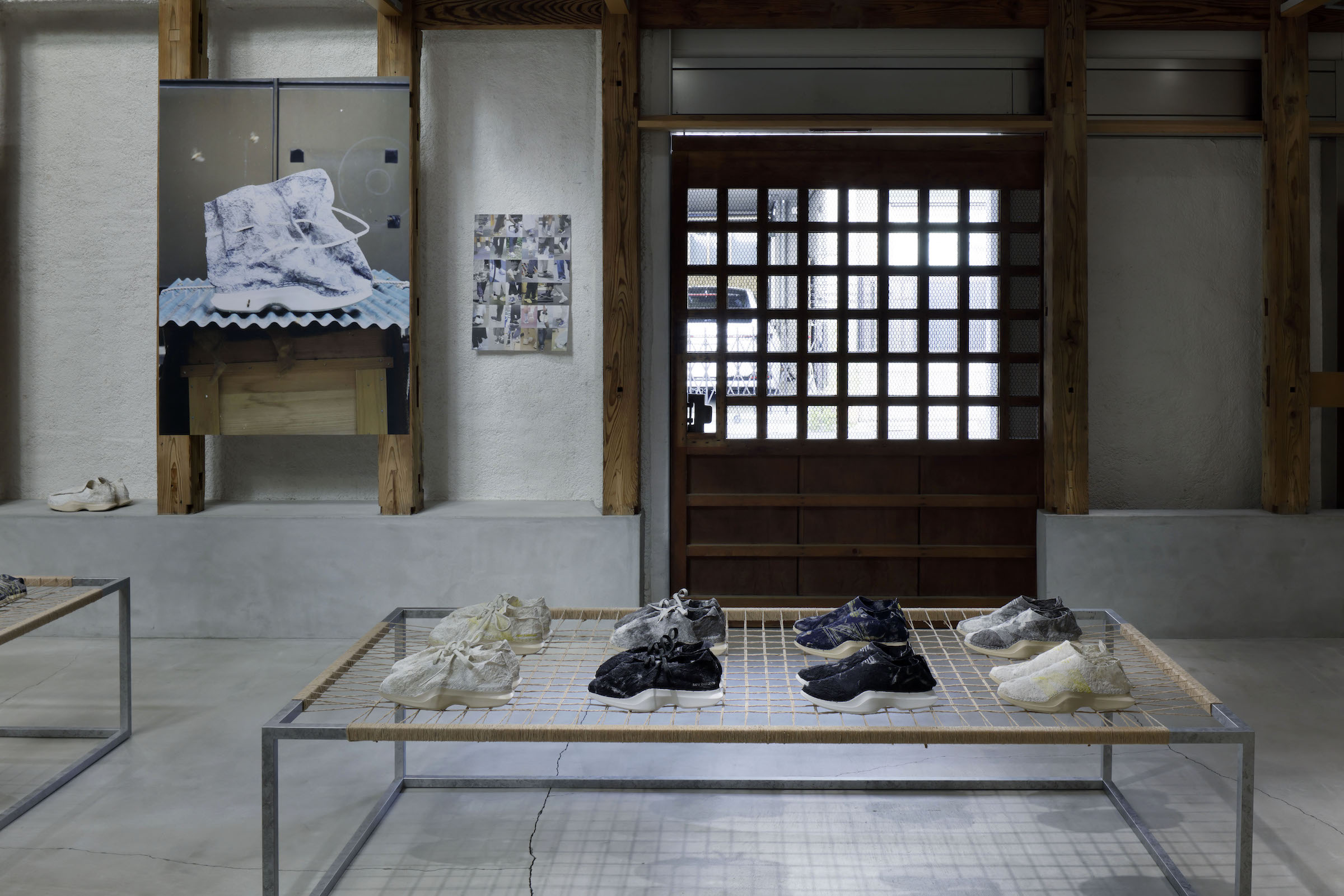 第一回目は、実際に靴の生産工程で出てくるスエードや革など様々な端材をまずは繊維状に戻すところから始めました。その後、和紙と組み合わせて、また一枚の和紙にしてから既存の靴の型に当てはめて組み上げたものを展示して。靴だけではなく、シューズボックスやシューレースなど関連した部品の制作も同じように試みましたね。シューズボックスは、また靴とは違い、梱包としての耐久性が問われるものだったので、オリジナルのダンボールと組み合わた3層構造に仕上げ、表面の一枚に和紙を採用しました。将来的にシューズが完成したあかつきには、シューズボックスも実際に使えるクオリティにしています。第二回目は、靴は作らず、ユーザーが靴を使うサイクルに焦点を当てました。どうしても靴って履き潰したら捨ててしまいますよね。でも本来は定期的な補修やクリーニングさえ施せば、より長く使えるようになる。そこで、店舗にニューバランスで購入した靴を持ってくれば、クリーニングできるサービスボックスを設置しました。最終的に、綺麗になった靴を第一回目で作ったシューズボックスに入れてお渡しするような仕組みにしました。