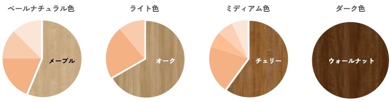 現在の住宅インテリアカラーには大きく分けて7種の系統の色がありますが、そのうち木材らしい4つの色では、ペールナチュラル色ならメープル、ライト色ならオーク、ミディアム色ならチェリー、ダーク色ならブラックウォールナットでの設定がそれぞれ半数以上を占めています。この4種はそれぞれの材色を活かした使われ方をしていて、定番樹種になっているといえます。