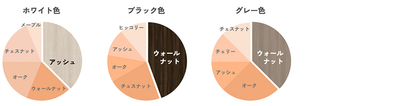 なおホワイト色やブラック色は木材本来の色から少し外れていて、塗装など着色の要素が強いため、樹種のバリエーションはやや広くなっています。ただ木目が見えにくい色ですので、できるだけ木目をしっかり表現できるオークやアッシュ等の環孔材と呼ばれる樹種が比較的多く使用されています。