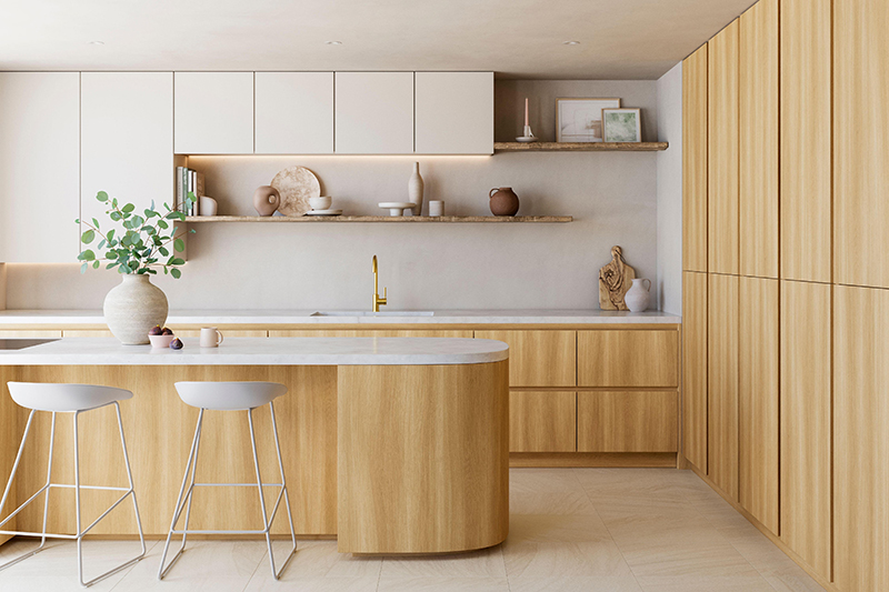 ライトブラウンからホワイトへのグラデーションの中に、ピンクとモスグリーン、ゴールドのアクセントでまとめ、アイランドキッチンはR形状にして柄をしっかりと見せつつ、優しいイメージに。小物はハンドメイド感があり、マットな質感のものを中心にセレクト。