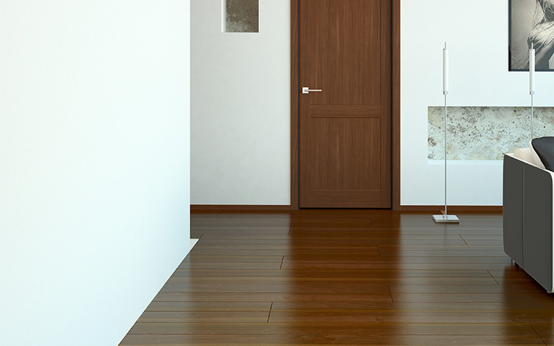 フローリングにはオーク材を厚い塗膜によってカラーリングしたものが重用され、ドア向け化粧シートはその床の色や雰囲気に近づけることが求められました。シートの表層の仕上げにも拘り、カラーリングされた重厚な木の質感に似せる為に、濃色インクを駆使する事で再現する事ができました。