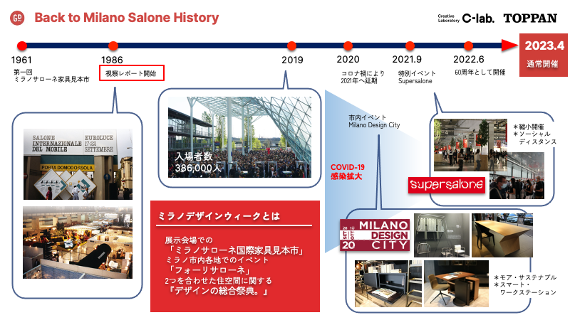 ミラノサローネが初めて開催されたのは1961年です。C-lab.では1986年からミラノサローネ視察を開始しました。今回、そのヒストリーを振り返ることで、ミラノサローネの発展やトレンドがどのように形成されたかをご紹介し、これからのデザインの方向性を探る参考になればと思います。
