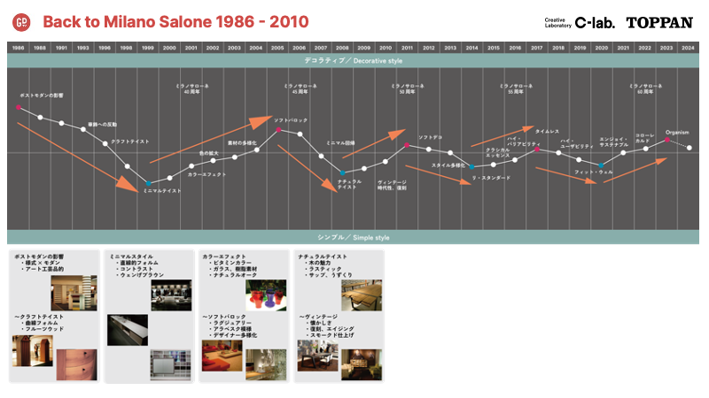 1986年から1996年の10年間は、ポストモダンスタイルのデコラティブなスタイルから徐々にシンプルなスタイルへシフトした期間でした。続いて、1998年から2000年はブラック&ホワイトのミニマルスタイルが確立。2001年から2006年はミラノサローネ40周年、45周年を迎えた期間、ミニマルスタイルの反動からデコラティブなスタイルへシフトしていきました。そして、2007年から2010年は、ナチュラルテイストへのシフトが見られ、ヴィンテージスタイルが注目されました。