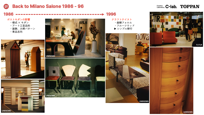ポストモダニズムが建築やデザインに大きな影響を与えていたこの頃、1986年はミラノサローネでも高級感のある従来のイタリアンモダンデザインに加え、様々な家具にもその影響を見ることができた。1996年は、ポストモダンに代表される過度なデザインからシンプルなデザインへシフトする兆しが見え始めた年。直線的なフォルムや緩やかな曲線を取り入れた家具が主流の年だった。(ミラノサローネプレミアムブックより引用)