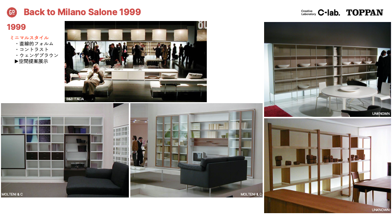 ZENスタイル、ミニマルスタイルは家具のみならず、ファッションを含めたライフスタイル全般に拡大。1999年は、ストレートライン、ニュートラルカラー、ブラック&ホワイト、コントラストコーディネート等、今後に繋がる基本スタイルが生まれた節目の年だった。(ミラノサローネプレミアムブックより引用)