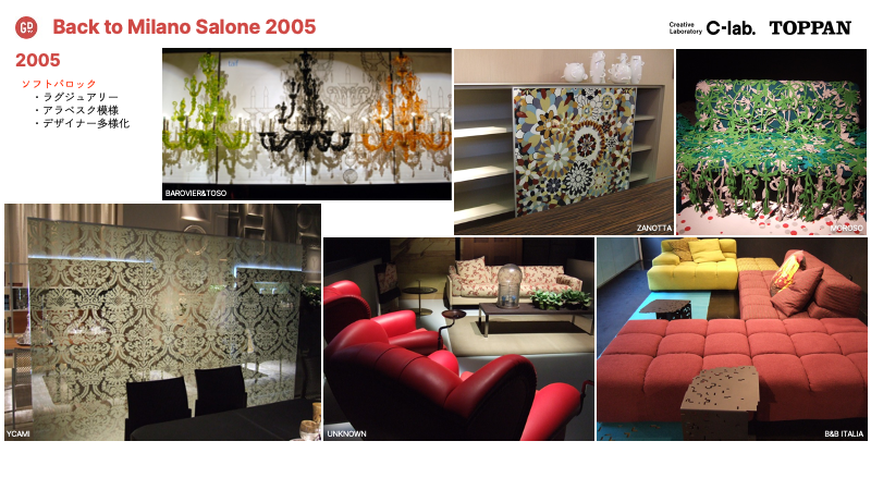 ゴージャス&ラグジュアリー!ソフトバロックスタイルがトレンド。2005年は一気にデコラティブの方向にシフトした節目の年。様々なカラー、アラベスク模様や花柄、幾何パターン、豪華なシャンデリア等、とても華やかな年だった。(ミラノサローネプレミアムブックより引用)