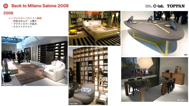 Moliteni&Cの巨大なブラック&ホワイトの収納が印象的だった2008年は、ニュートラル系やブラウンを基調としたミニマルスタイルが継続。またクラフトテイストやビビットなカラーをアクセントにした家具、ラウンドフォルムの椅子やテーブル等のニューデザインが発表された年だった。(ミラノサローネプレミアムブックより引用)