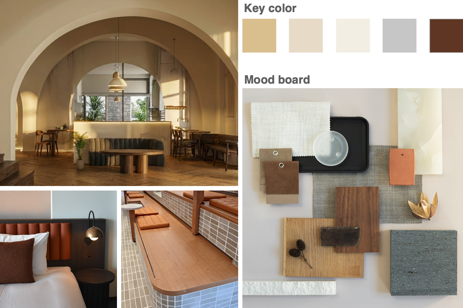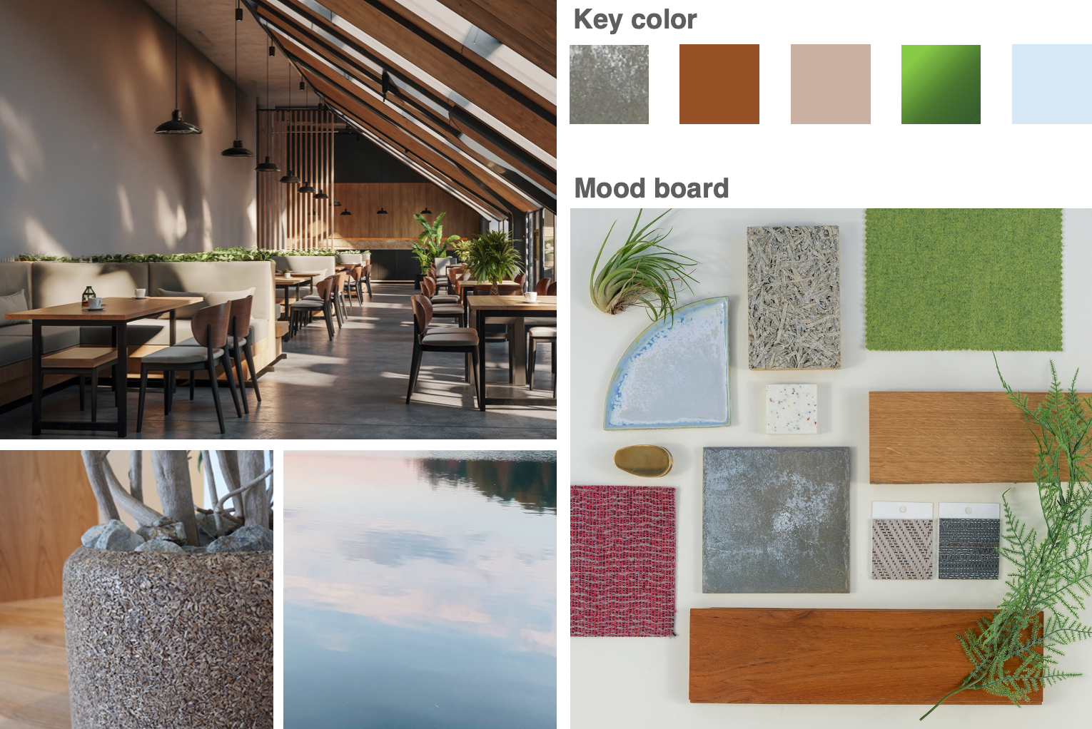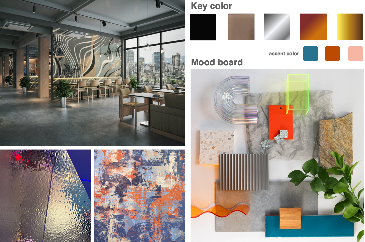 *ムードボード:2025年8月に千葉県柏にオープンしたTOPPANの新施設「サーフェスパーク」にて、それぞれの空間を彩る素材、インテリア小物を選定、検証しボードを作成しました。CMF+Pのハーモニーをご覧ください。