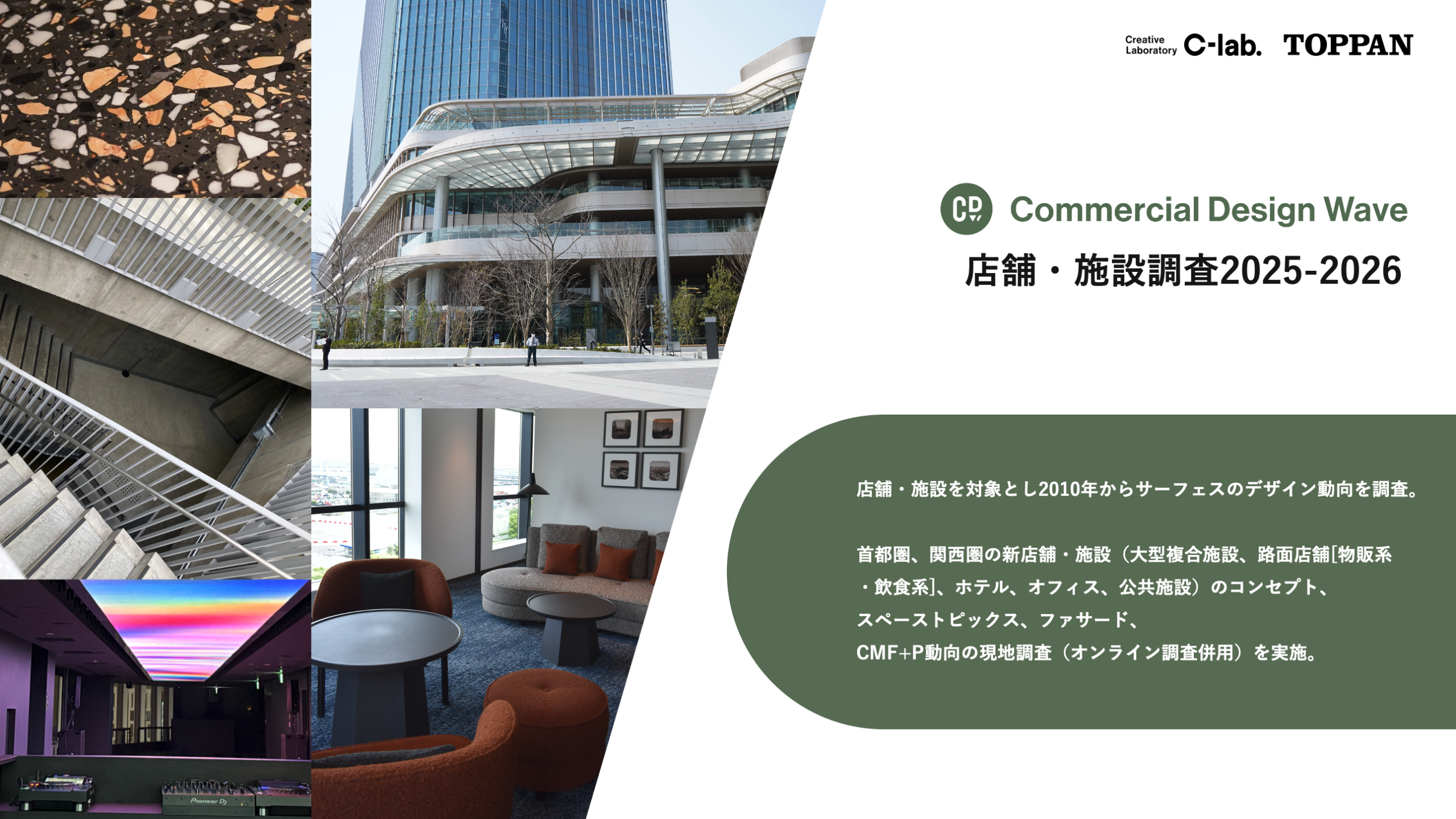 C-lab.ではこのほかにも、業態別(大型商業施設、路面店舗、ホテル、オフィス、公共施設)出現率の推移、部位別(床、壁・天井、什器)、インテリアスタイル推移、ファサードのCMF+P、トピックス等、様々な切り口からコマーシャル空間の今を切り取り、次代への兆しを読み解くアプローチを続けています。