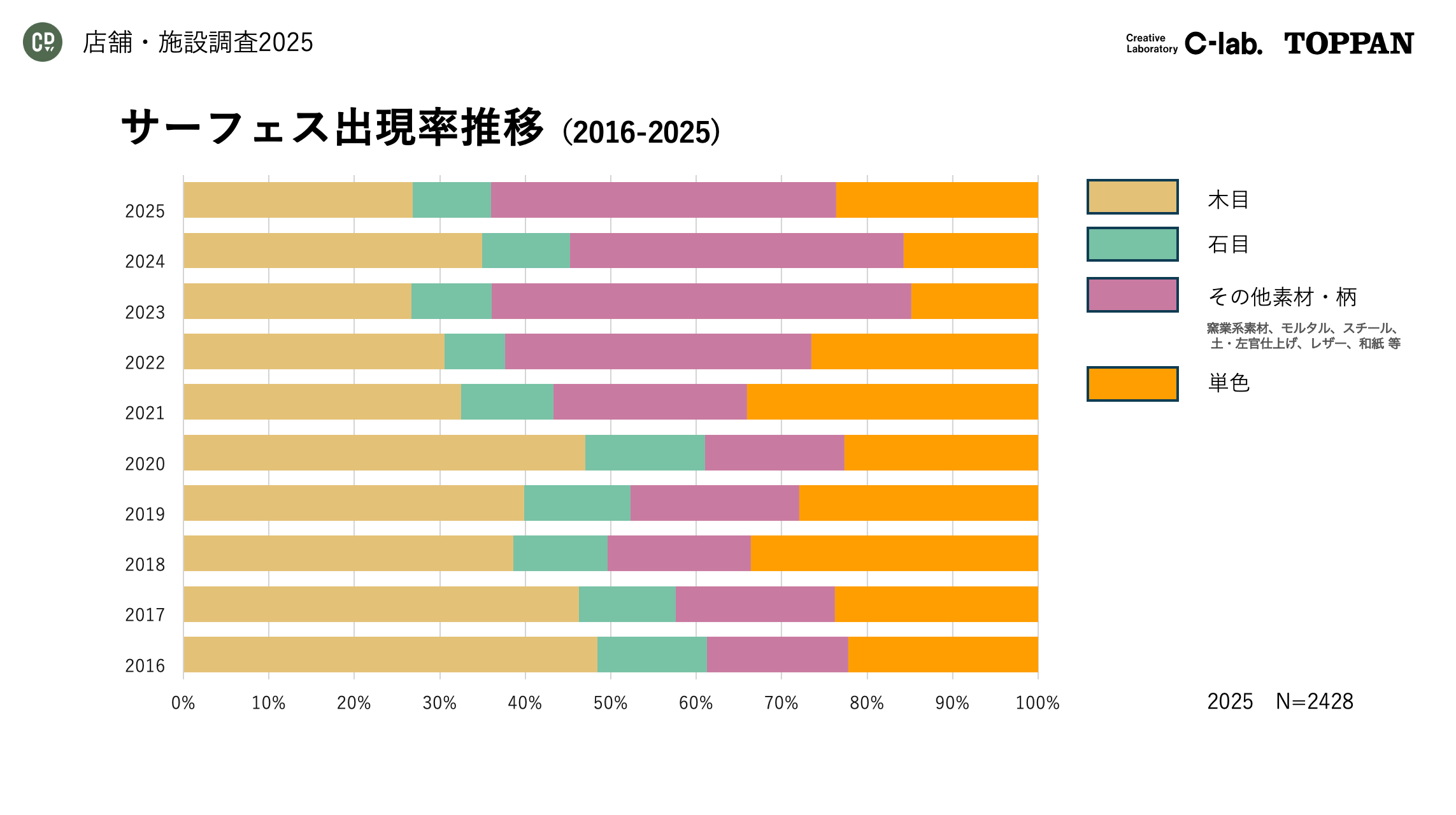2016年から2025年、過去10年のサーフェス(木目、石目、その他素材・柄、単色)の出現率の推移を示した。