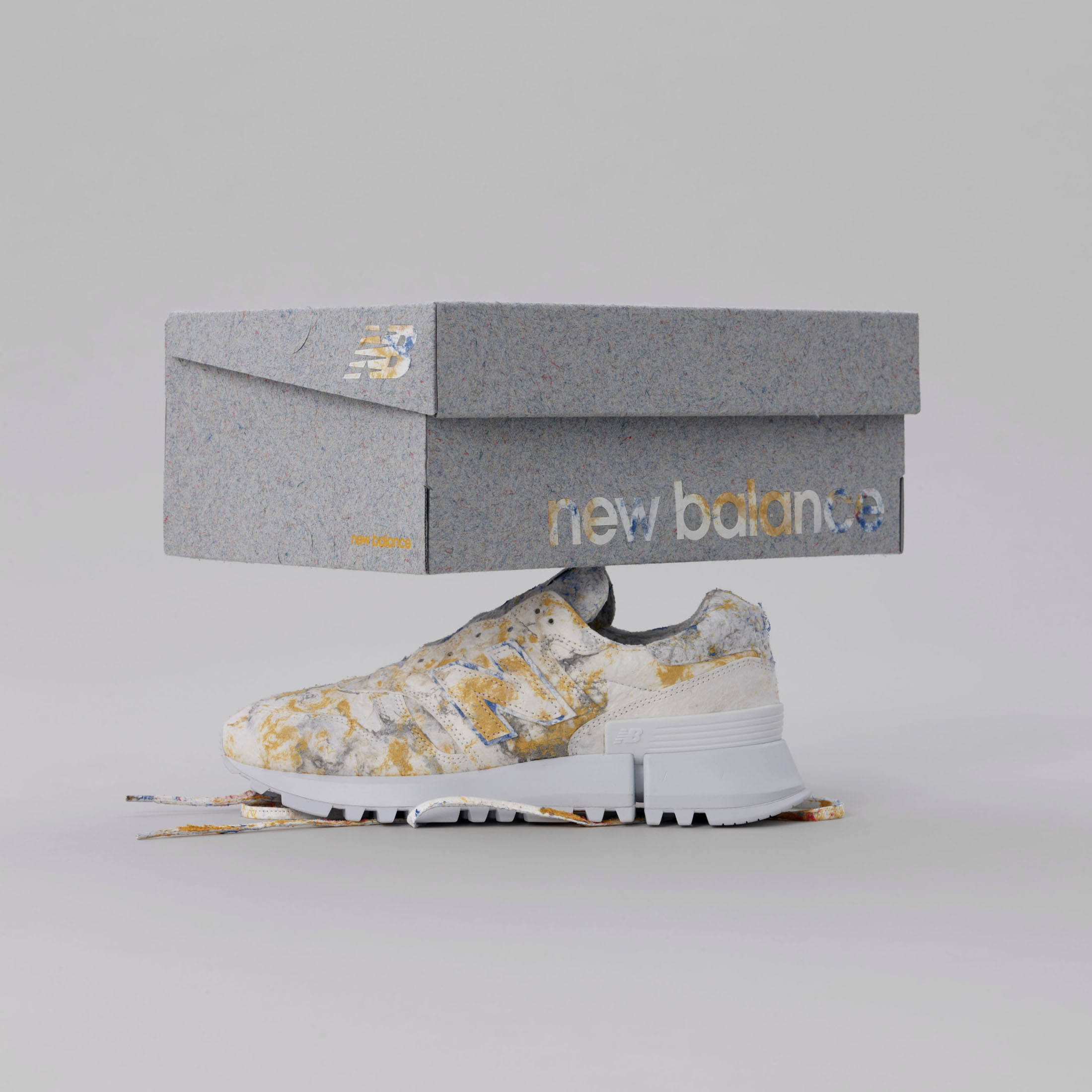 2020年からTOKYO DESIGN STUDIO New Balanceと協働し、靴の生産方法における新しいやり方やデザインを模索しています。サステナブルについても世の中の関心が強まってきた時代背景も相まって、おのずと和紙と靴の端材の組み合わせを試すようになりました。しかし、靴は予想以上に強度が求められるプロダクトでしたので、すぐさま短期間で紙で靴を作るということは構造的に難しく、本展に至るまでリサーチと実験含めたプロジェクトを2回行いました。