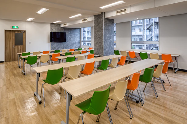 日本地工株式会社様の事例では、オフィス内食堂の改修を行いました。「窓が東側のため暗い時間が多い」「雰囲気を一新したい」というご要望に対し、ライト色の建材とビビットな什器を活用して明るい空間を実現。