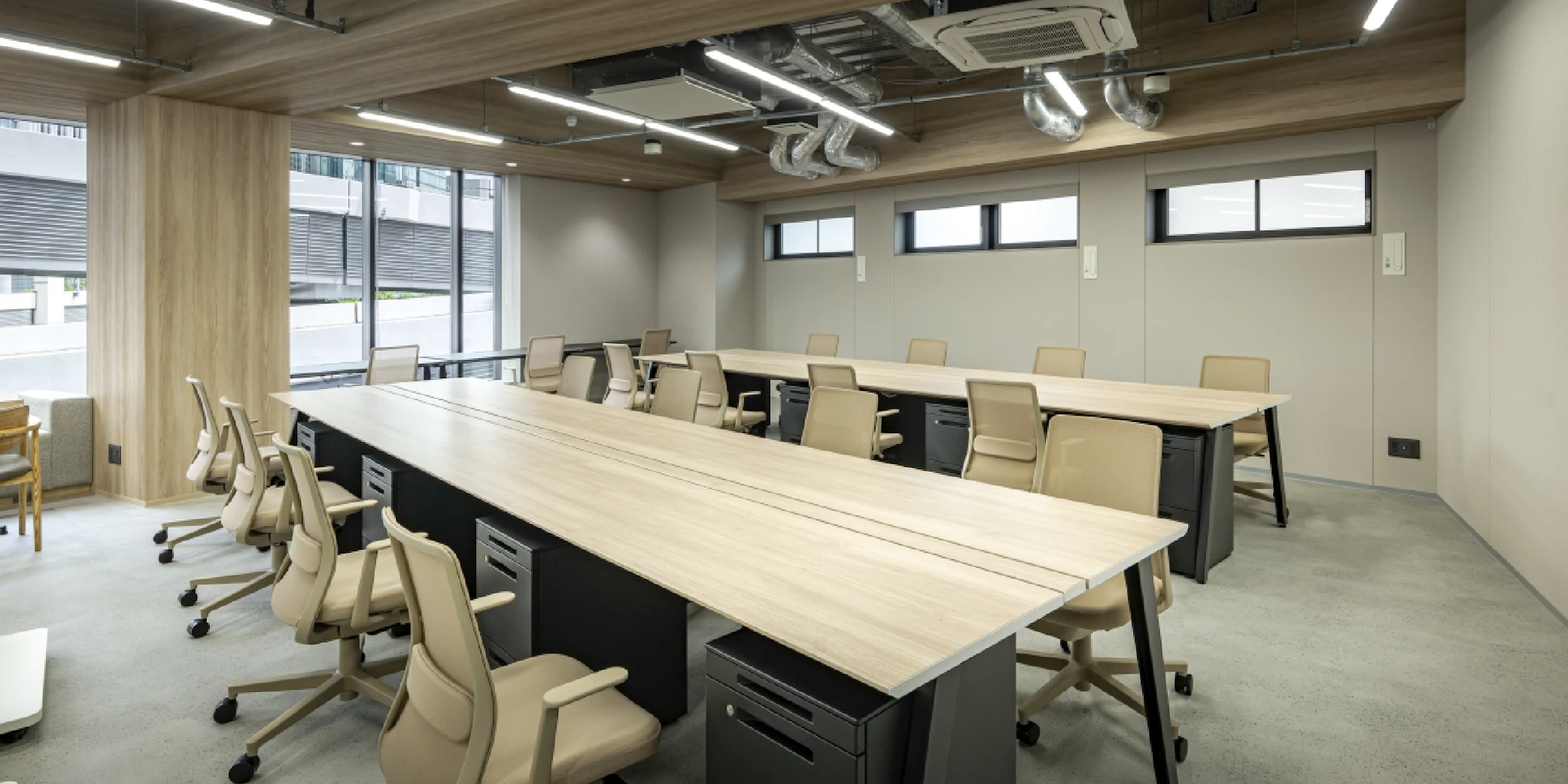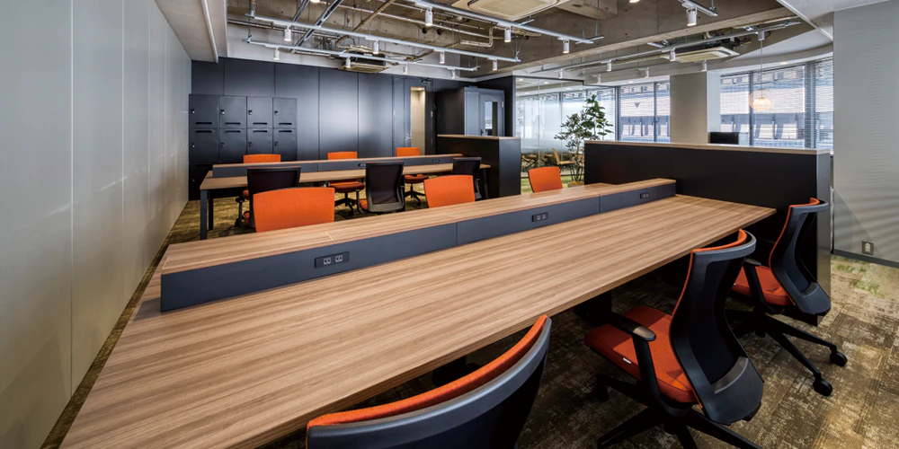 フレキシブルな働き方を実現するため執務室の内装を変更し、多様なワークエリアやレイアウト変更が可能な共用エリアを増設しています。また、遮蔽物の少ない設計にすることで、偶発的なコミュニケーションを生む空間に仕上げました。