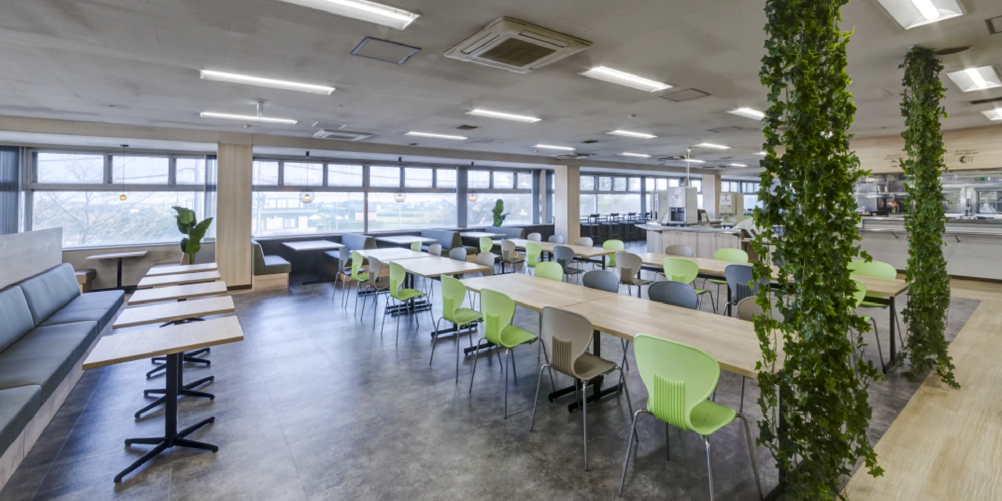 既存の食堂では「窓が東側のため暗い時間が多い」という課題があり、「雰囲気を一新したい」とのご要望がありました。ライト色の建材とビビットな什器を採用し、明るい空間に仕上げました。