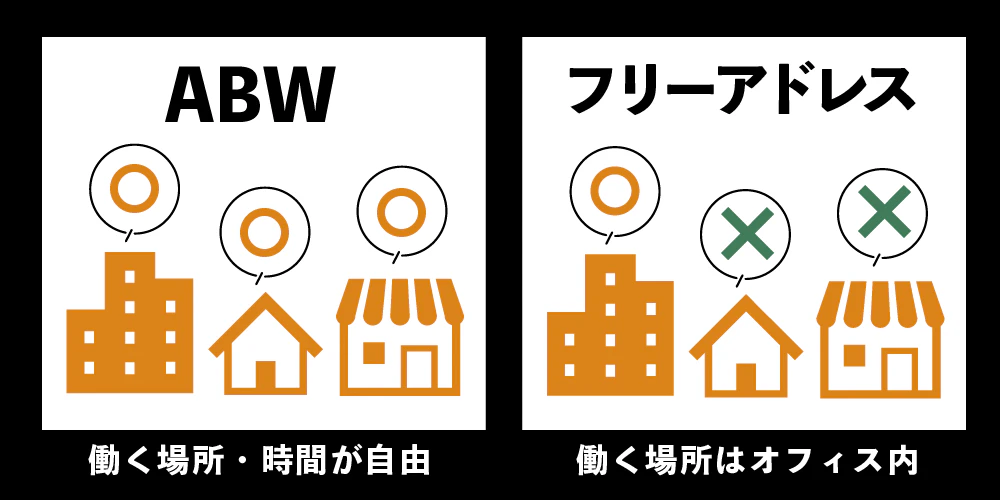 よく似ている言葉として「フリーアドレス」がありますが、フリーアドレスにおいて働く場所はオフィスに限定されています。ABWでは働く場所に制限はないため、より自由度の高いオフィススタイルなのです。