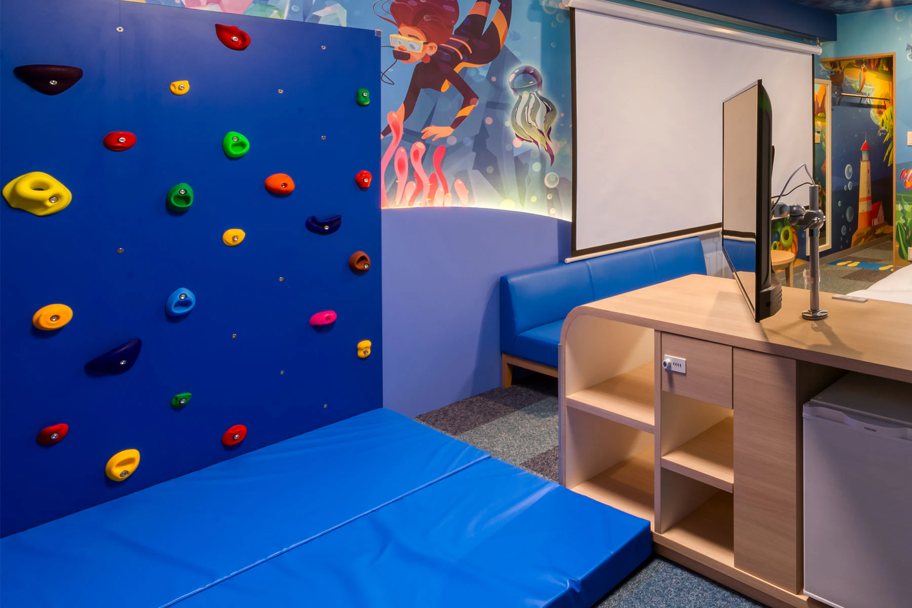 「海」をテーマにした客室は、海の世界観を連想させるフォトジェニックなデザインが特徴。壁面にはボルダリングボードを設置し、「体育」の要素を取り入れています。