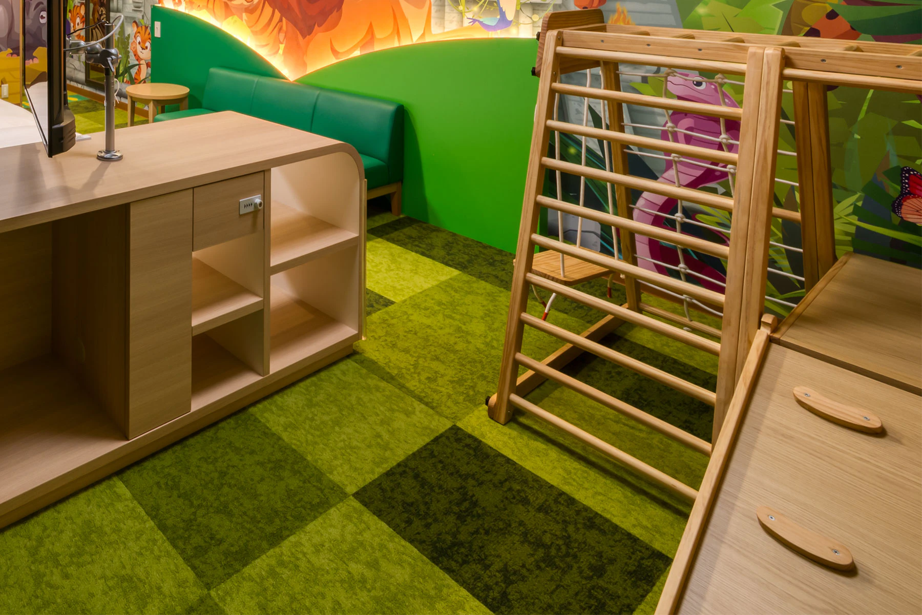 「森」をテーマにした客室は、緑が与える癒しと憩いを重視したデザイン。ジャングルジムを設置することで「体育」の要素も加味しています。