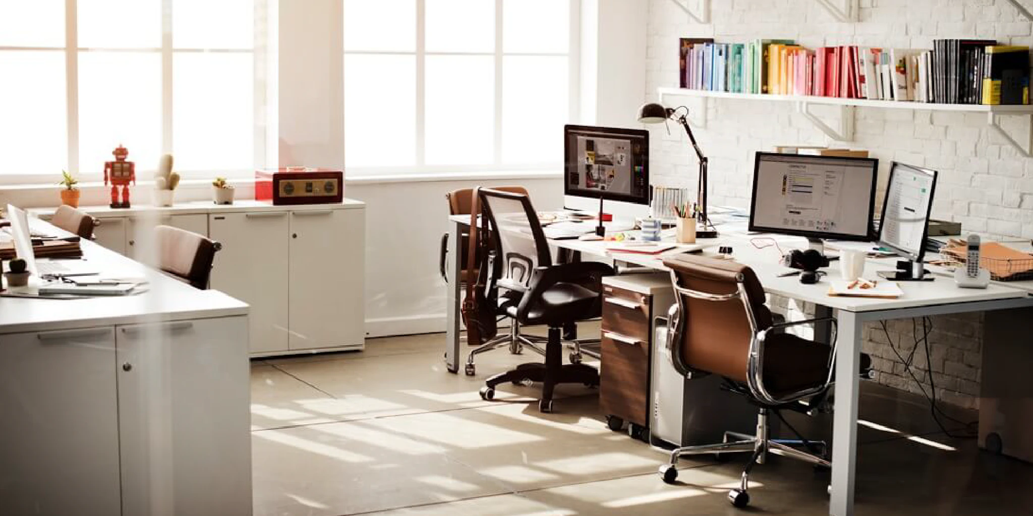 また、個人の収納スペースは、デスク周りではなく共用のキャビネットで確保するなど、デスク面積を最大限に活用する工夫が必要です。