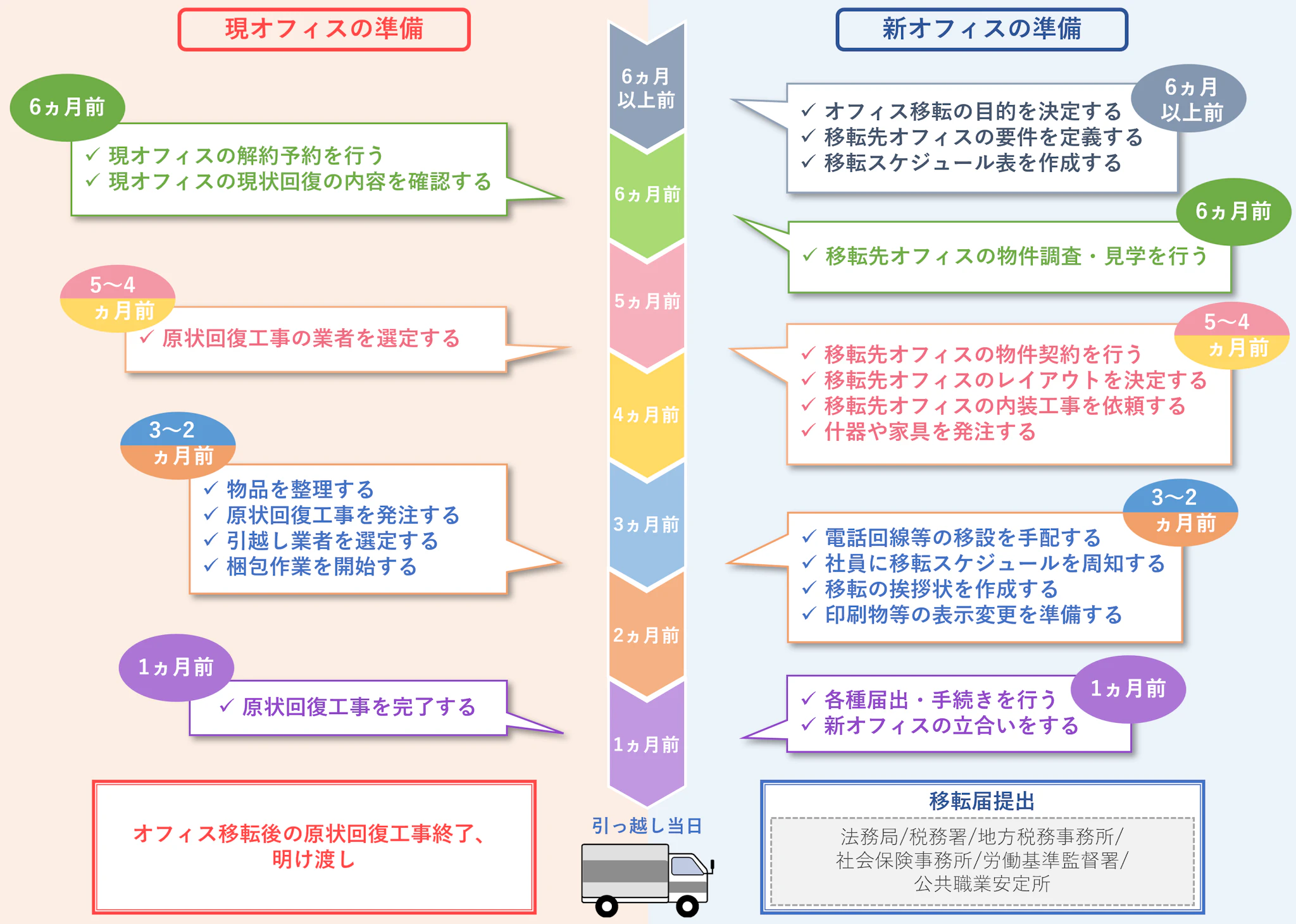 オフィス移転を円滑に進めるには、移転の6ヵ月以上前から準備を始めることが重要です。